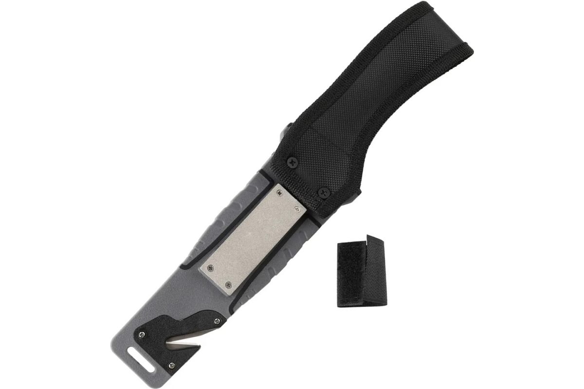 С обратной стороны чехла встроена компактная металлическая пластина с алмазным напылением, которая является практичной и легкой точилкой для ровного участка лезвия.