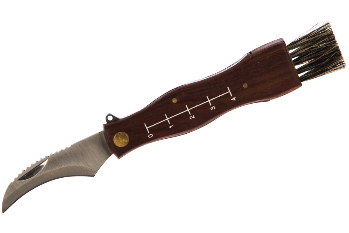 Нож имеет изогнутую форму клинка, напоминающую серп. Обладает высокой прочностью и твердостью. Зубчатая верхняя кромка позволяет легко счищать остатки земли с ножки гриба.