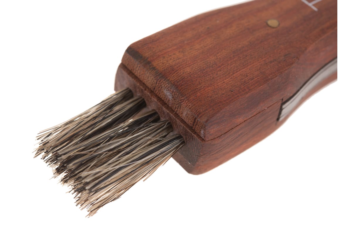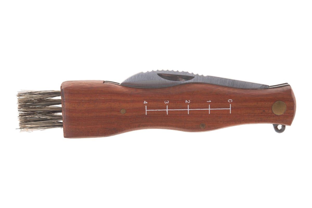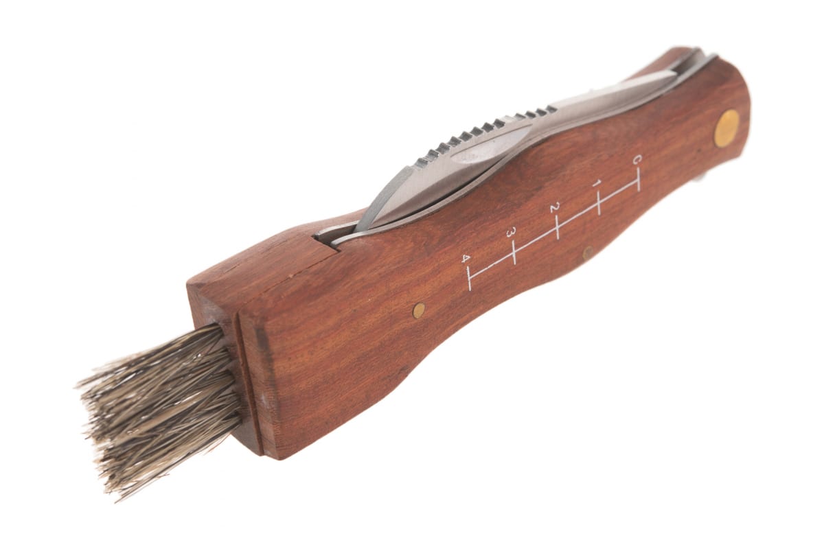 Деревянная рукоять покрыта лаком для лучшей износостойкости. На ее конце расположена кисточка, которая помогает счищать скопившийся сор на поверхности шляпки гриба.