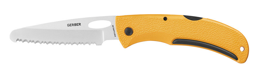 Описание: Отличительной чертой ножа Gerber E-Z Out Rescue является броский дизайн, благодаря тому, что рукоятка ножа - ярко-желтого цвета. Лезвие имеет по всей длине серрейторную заточку, а также тупую форму острия, что предотвращает случайное травмирование при использовании.