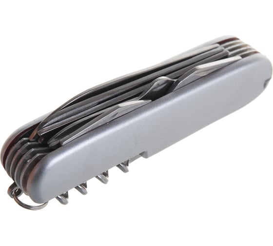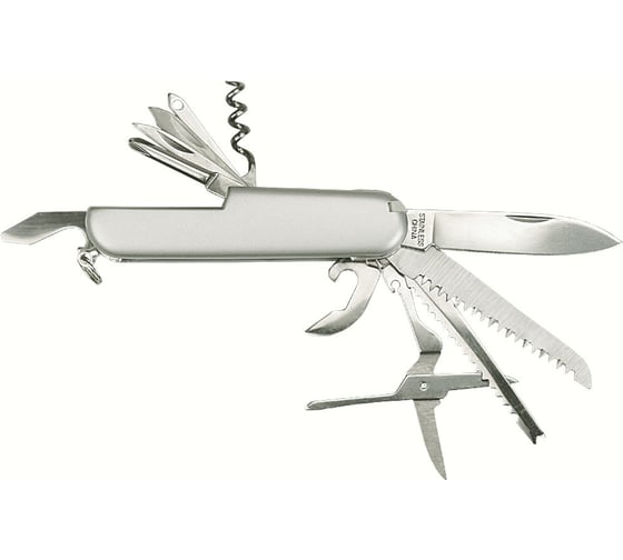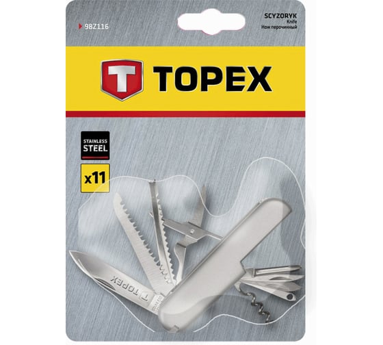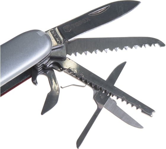 Перочинный нож TOPEX 11 лезвий 98Z116 изготовлен из прочной нержавеющей стали, гарантирует долгий срок службы. Практичен и универсален в использовании, в наборе наконечники широкого применения, включающие в себя: нож, ножницы, пилу, скребок, открывалку для бутылок, открывалку для консервных банок, штопор, шило, гвоздодер, отвертку PH, напильник За счет компактности его всегда можно носить с собой.