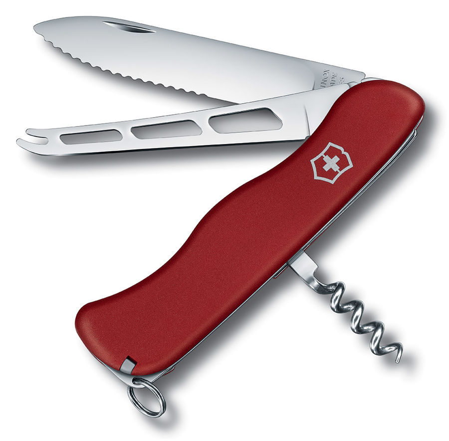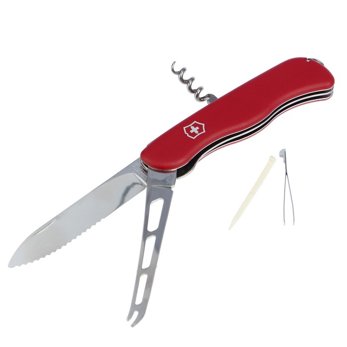 Список функций Лезвие, большое, с волнистым краем; штопор; брелок для ключей; зубочистка; пинцет; нож для сыра.