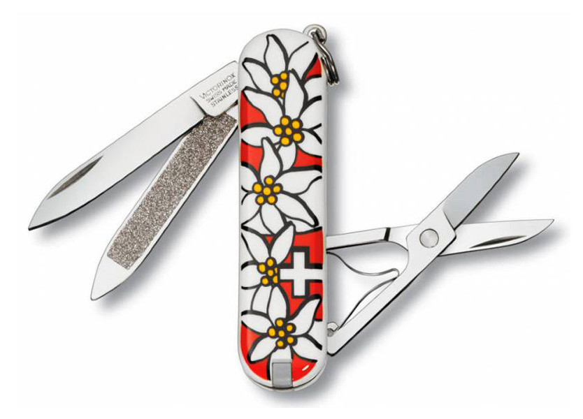 Список функций: лезвие, ножницы, кольцо для ключей, пинцет, зубочистка, пилка для ногтей с инструментом по уходу за ногтями