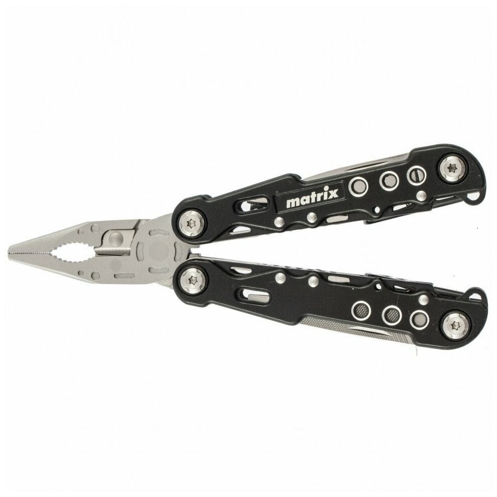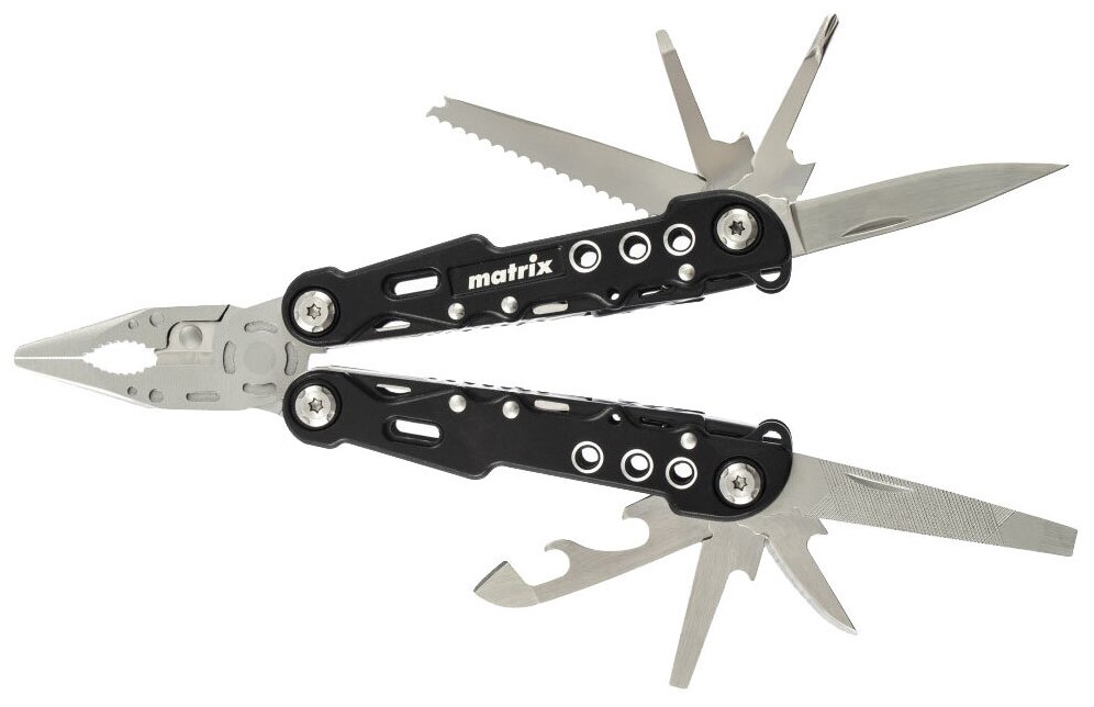 Трансформер MATRIX, 13 функций, авторазжим, в чехле, 165 мм 17622 может быть полезен на рыбалке, на даче, во время отдыха на природе, в гараже или автомобиле. Инструмент имеет удобный механизм трансформации, устойчив к износу и надежен. Для удобства транспортировки и хранения поставляется в защитном чехле.