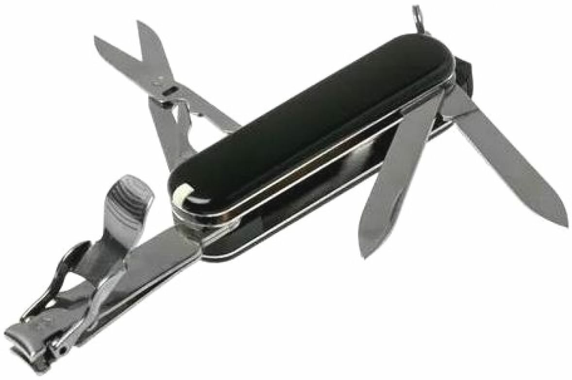 Лезвие Пилка для ногтей с: - Инструментом для ухода за ногтями; Книпсер (кусачки для ногтей); Ножницы с серрейторной заточкой; Пинцет; Зубочистка; Кольцо для ключей.