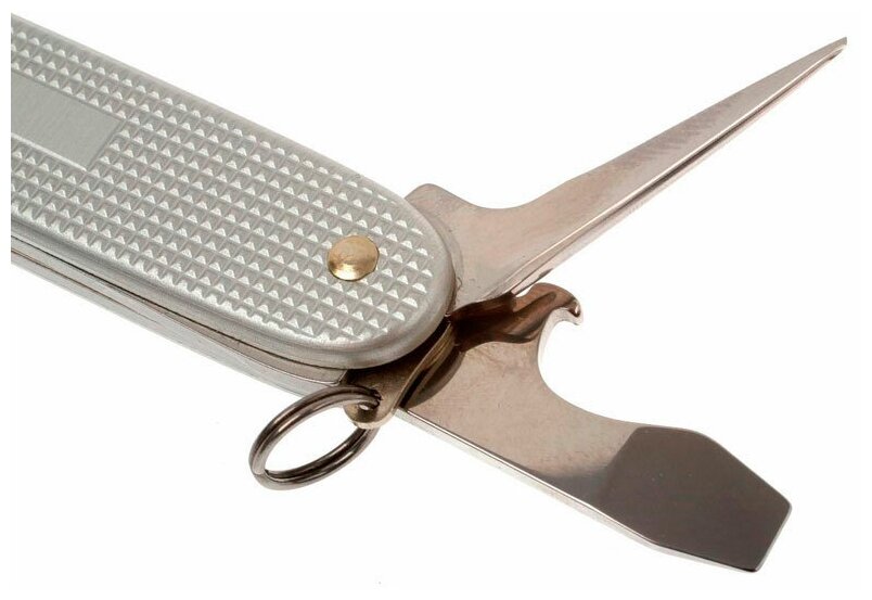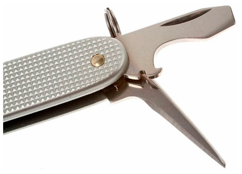 -Функции - большое лезвие, консервный нож, маленькая отвертка, открывалка для бутылок, отвертка, инструмент для снятия изоляции, шило, кольцо для ключей;
