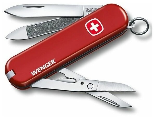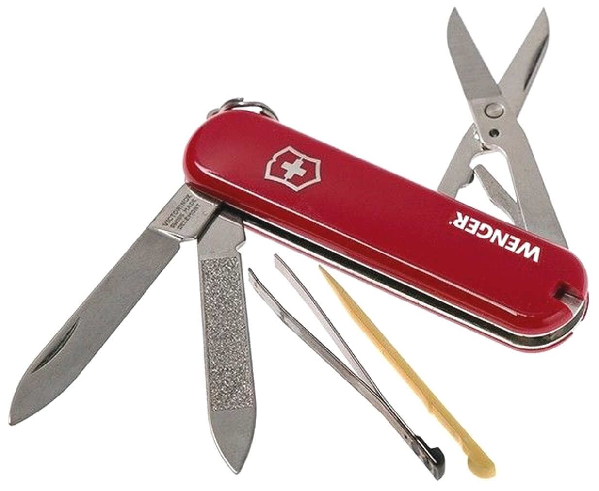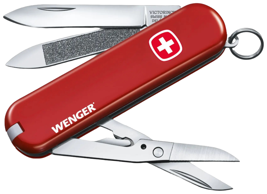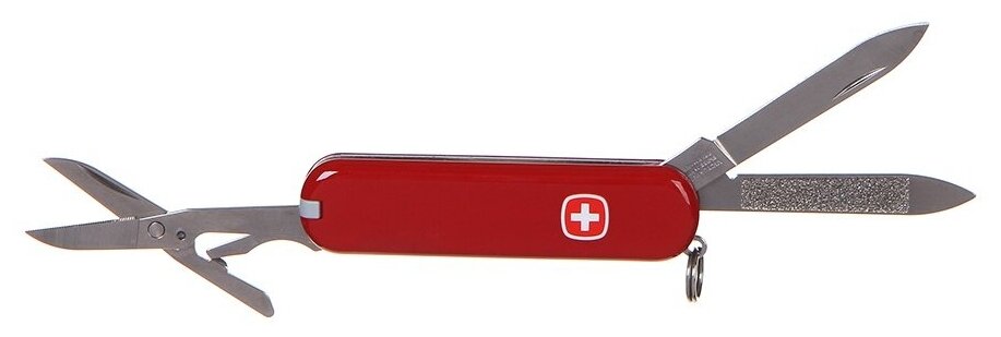 Лезвие, ножницы, пилка для ногтей, очиститель для ногтей, зубочистка, пинцет, колцо для брелка.
